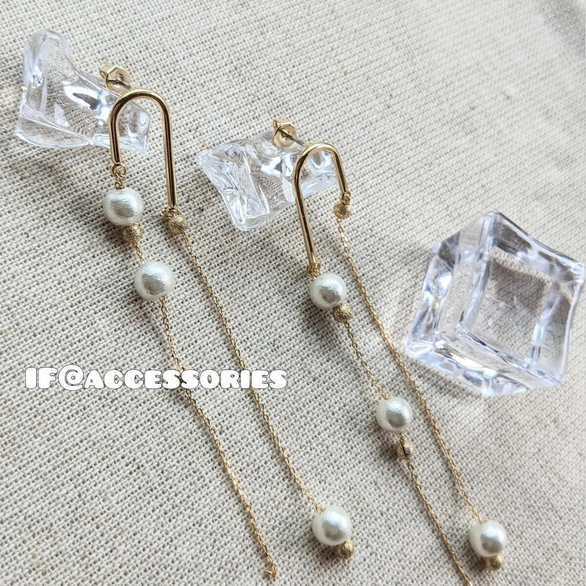 落ち着いたイメージを表現するため、使用したコットンパールは小さめのものでチェーンは太さが細いものを、各金属パーツについては黄色みが弱めのゴールドを選びました。お客様のイメージに沿ったアクセサリーになっていれば幸いです。
