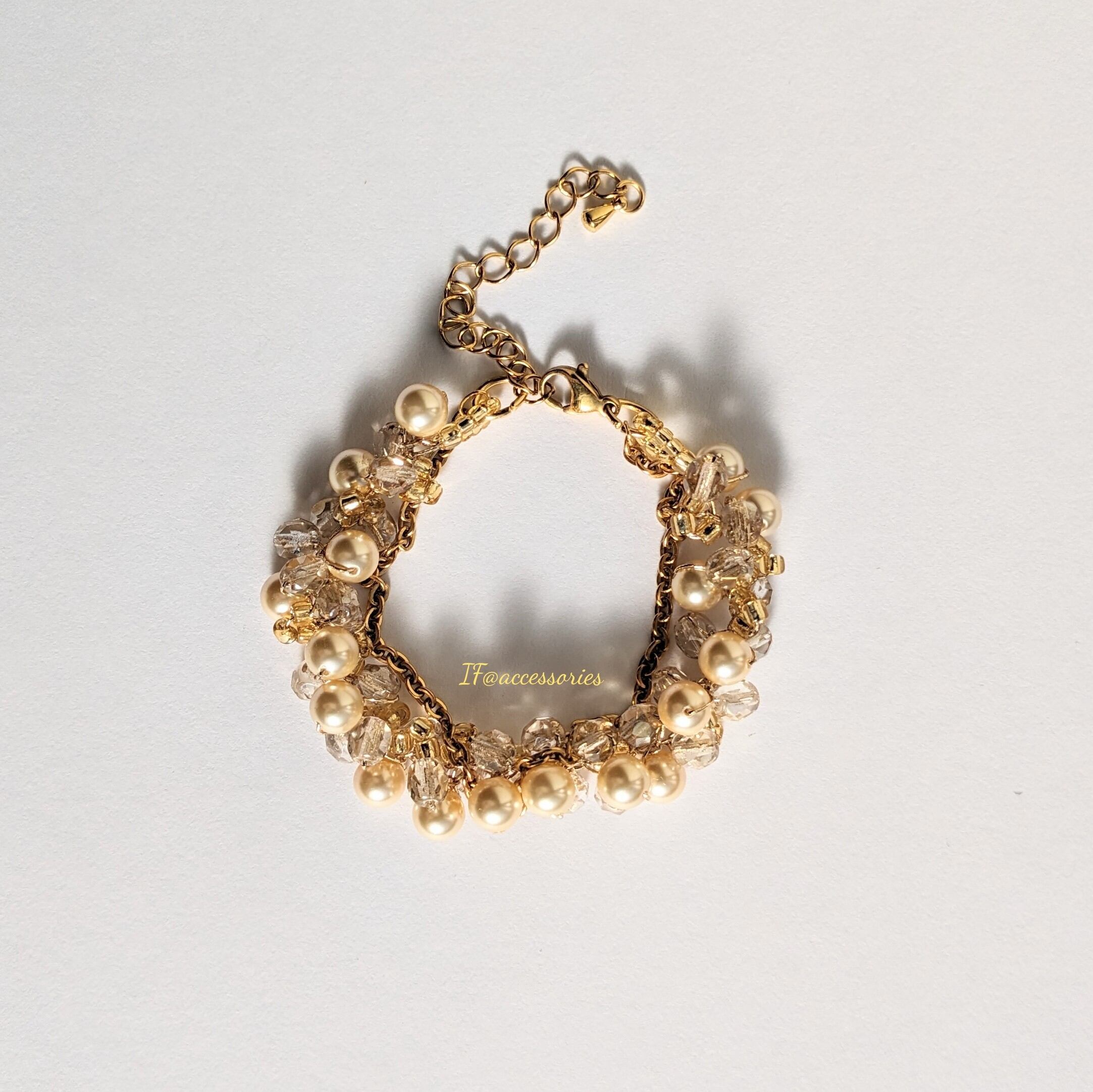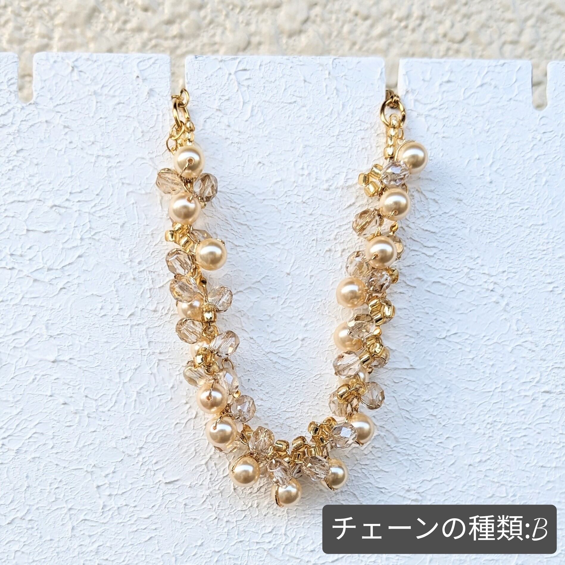 上質なライトゴールドのパールとクリアレグホーンのガラスビーズが、エレガントな印象を演出してくれます。