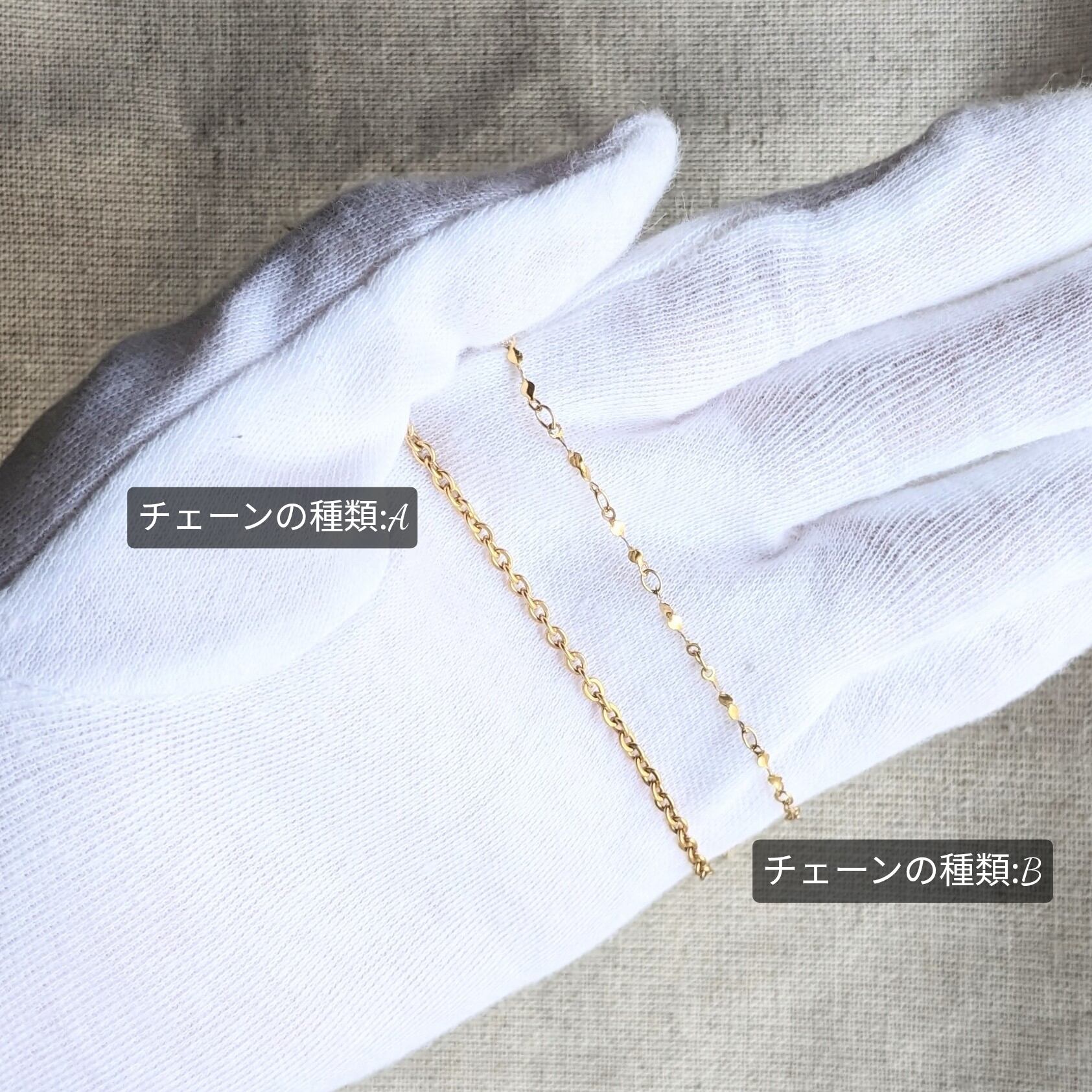 チェーンは2種類を用意しております。「A」は2.2mmの小豆チェーンで細めながらしっかりしたつくりです。「B」は2mm幅のデザイン高い細めのチェーンで華奢なつくりにです。「A」と「B」では価格が変化いたしますのでご注意ください。