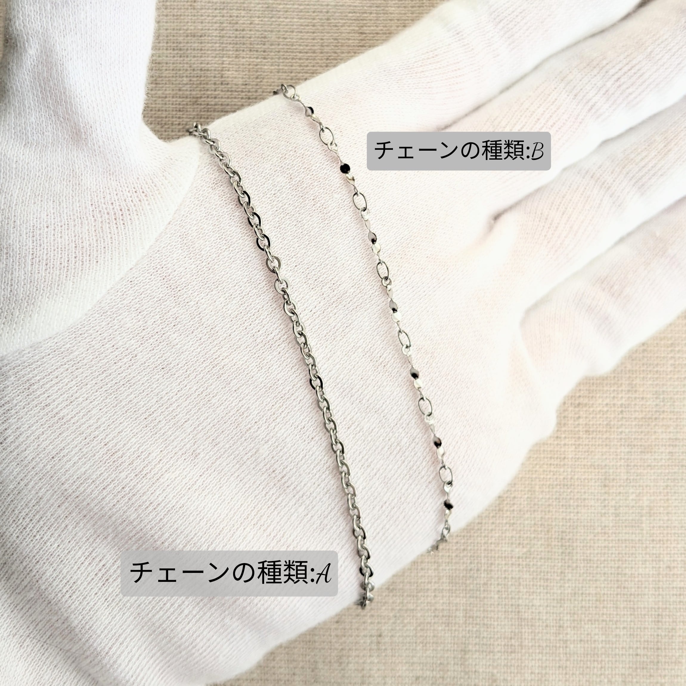 チェーンは2種類を用意しております。「A」は2.2mmの小豆チェーンで細めながらしっかりしたつくりです。「B」は2mm幅のデザイン高い細めのチェーンで華奢なつくりにです。「A」と「B」では価格が変化いたしますのでご注意ください。