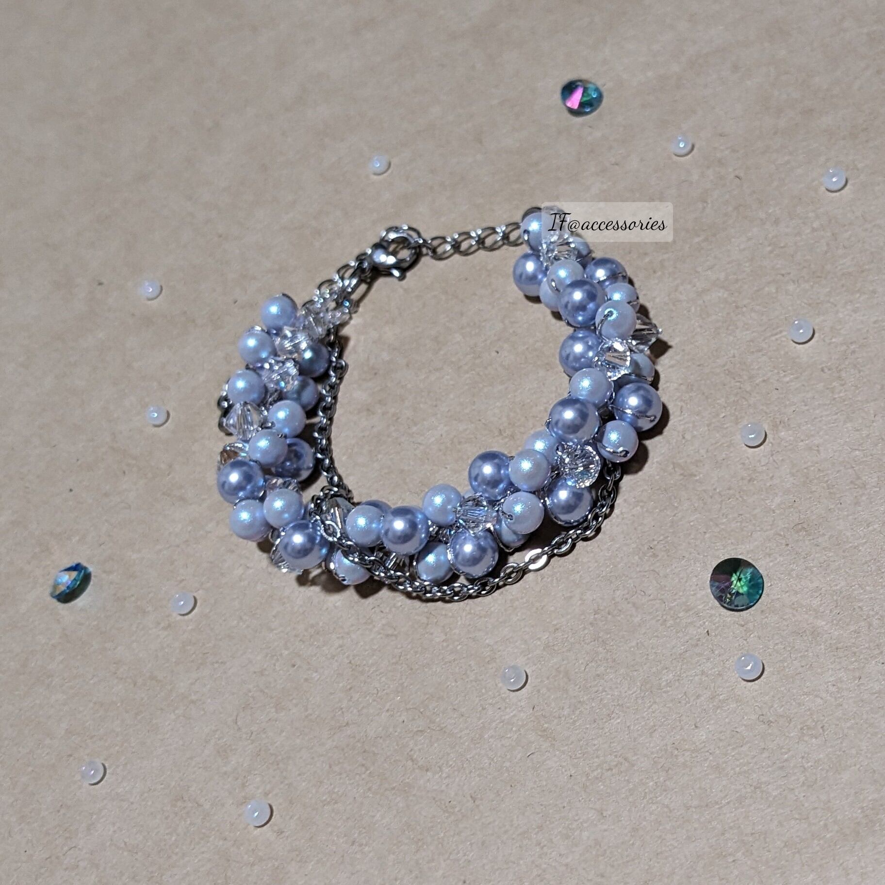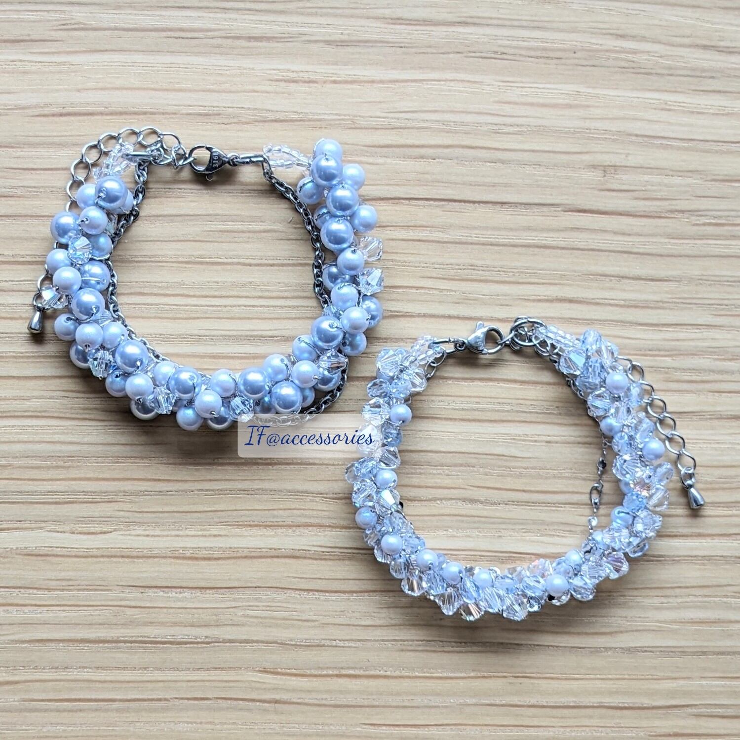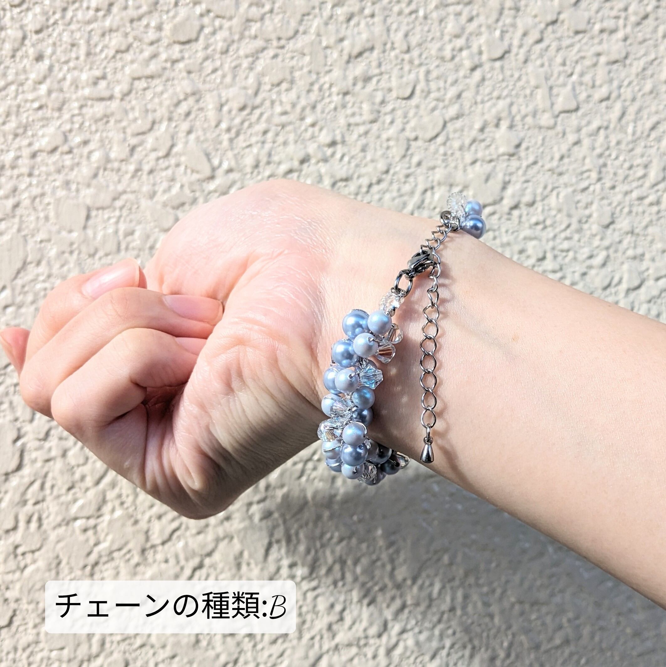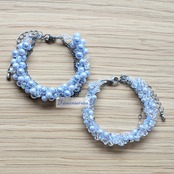 2種類の青色を上品にまとめた作品で、単体でも十分に活躍できる作品です。華奢なデザインのアクセサリーと組み合わせていただくことも可能ですので、様々な場面で活躍が見込めるちょっぴり上品なブレスレットです。